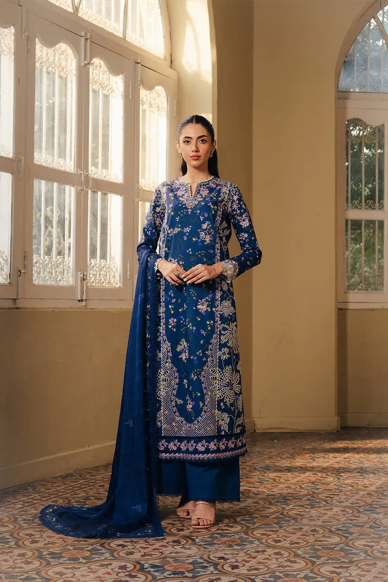 Deep sapphire elegance meets intricate craftsmanship in this striking ensemble. The richly embroidered lawn front is adorned with detailed floral and ornamental motifs that create a refined and statement-making silhouette. Subtle accents enhance the structure of the shirt, while the flowing sheer dupatta drapes gracefully, finished with delicate borders that add movement and polish. Paired with coordinated tonal bottoms, the look feels bold, graceful, and effortlessly sophisticated, perfect for festive gatherings and evening celebrations.