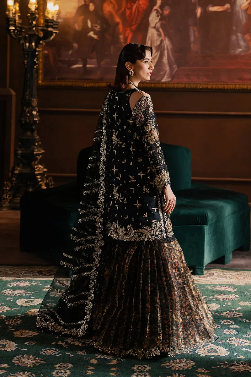An evocative expression of nocturnal elegance, this ensemble unfolds in deep ebony layered with antique gold detailing. The short shirt is intricately hand-embellished with resham, sequins, and metallic thread, forming ornate floral and vine motifs across the bodice and sleeves. Paired with a richly textured lehenga beneath, the look gains depth and movement through its softly pleated fall. Finished with a sheer, delicately bordered dupatta, the composition feels regal yet restrained — a timeless silhouette designed for grand evenings and heirloom moments.