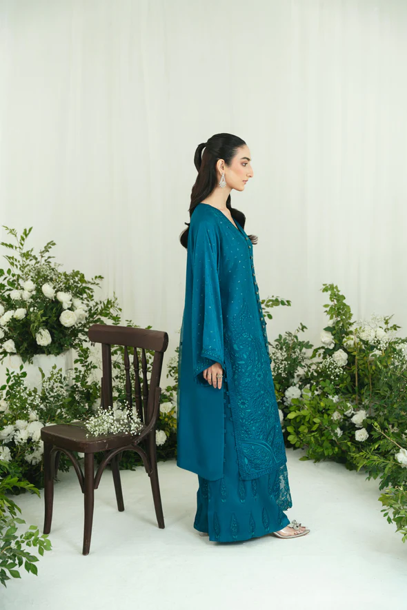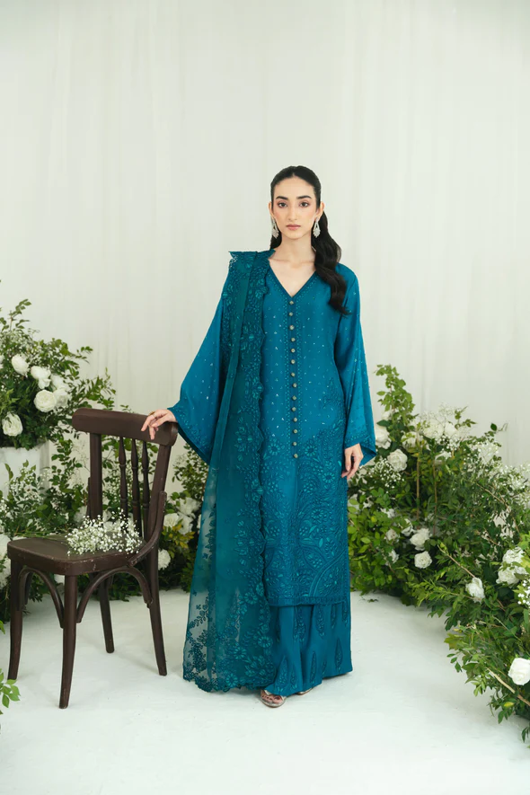 Rendered in a gorgeous teal blue canvas, this beautiful Agha Noor design radiates whimsical charm. The korean silk long kameez is embellished with pretty thread-work in contrasting hues accentuated with sequins. The matching korean silk lzaar are adorned with traditional paisleys providing balance to the playfully decorated long shirt. An alluring pure soft organza dupatta completes the set, scattered with hints of flora and edged with a floral border. Ideal for festivities, Bano Royale can be dressed up or down according to the occasion. This set celebrates soft, tonal femininity. The length of the long kameez is 48 inches.