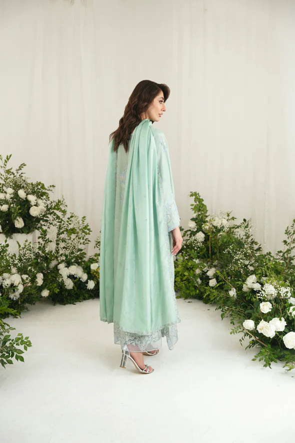 Curated on a gorgeous pastel aqua green hue (korean silk) with intricate ari embroidery alongside hand sewn crystals, the front features an organza appliquéd motif beautifully blending into the overall design, styled with matching korean silk trousers alongside pure medium silk dupatta adorned with ari motifs and a pretty dainty border on four sides making this one of our most sought after designs. The length of the long kameez is 50 inches.