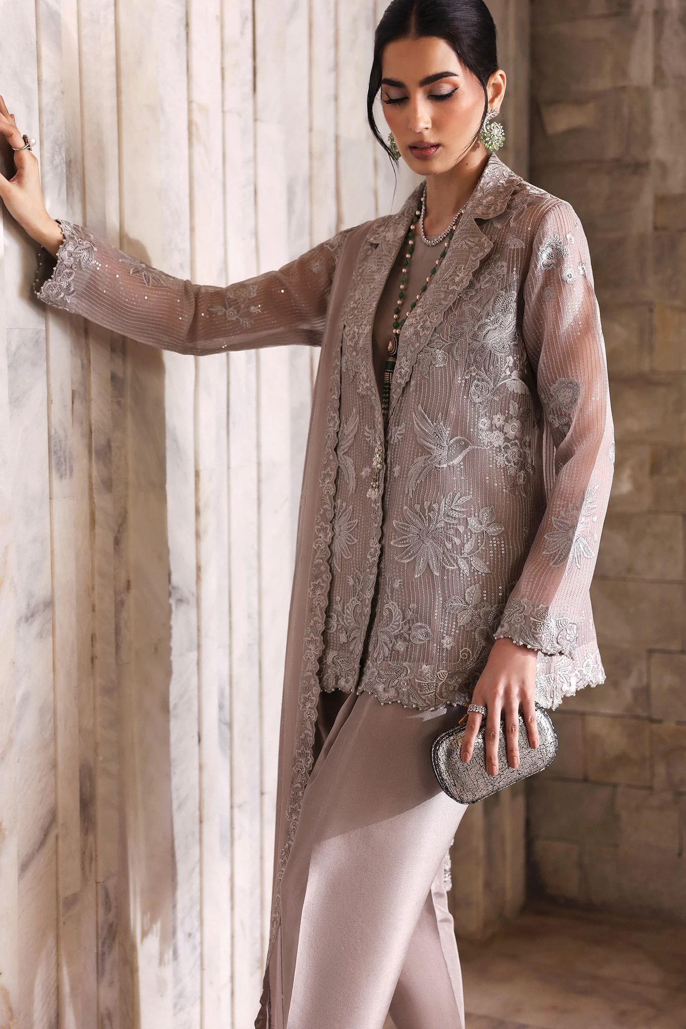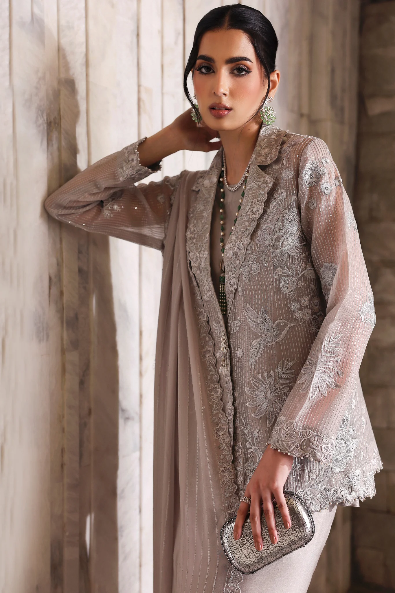 Effortlessly chic and refined, Halia is rendered in a soft taupe organza canvas adorned with intricate silver embroideries and delicate sequin linear textures. The modern jacket-style silhouette, framed with ornate Lacey borders, brings a contemporary edge to timeless craftsmanship.