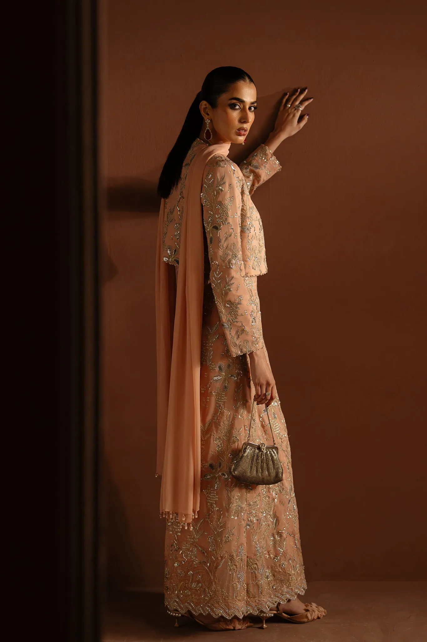 Rosée Sérénité is crafted on a tender blush canvas, delicately illuminated with fine tilla and threadwork embroidery that flows across the surface in intricate, floral-inspired patterns. The detailing feels light yet luminous, lending the ensemble an air of effortless refinement and quiet romance.