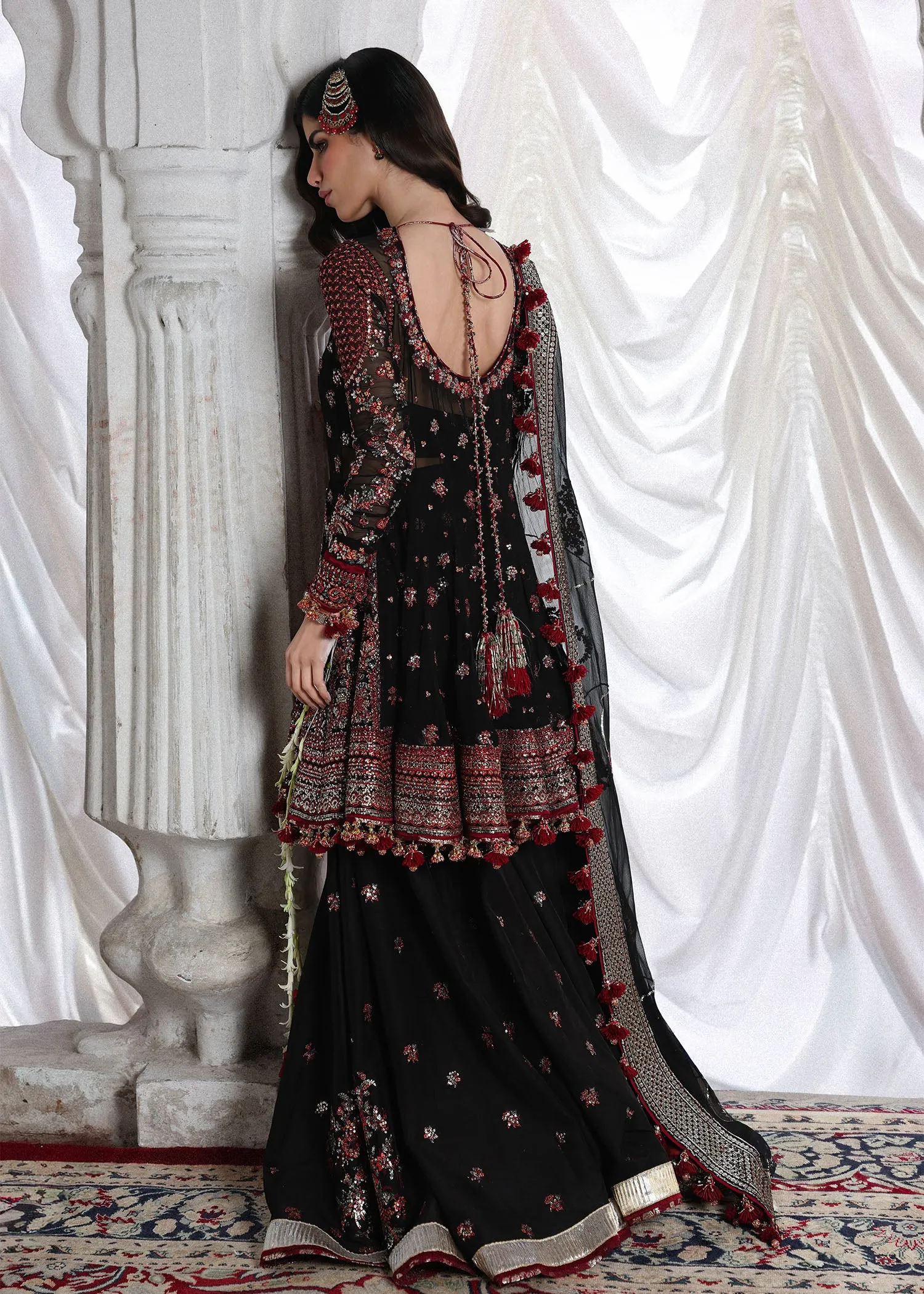 This striking black ensemble is a statement of timeless sophistication and refined elegance. The embroidered peplum is beautifully detailed with intricate panels, creating a bold yet graceful look. It is paired with a gracefully flared embroidered sharara, adding volume and fluid movement to the silhouette. Completing the ensemble is a matching embroidered dupatta, adorned with delicate detailing and finished with four-sided borders for a rich, luxurious appeal. Perfect for festive celebrations and formal occasions, this outfit beautifully blends classic charm with contemporary style.