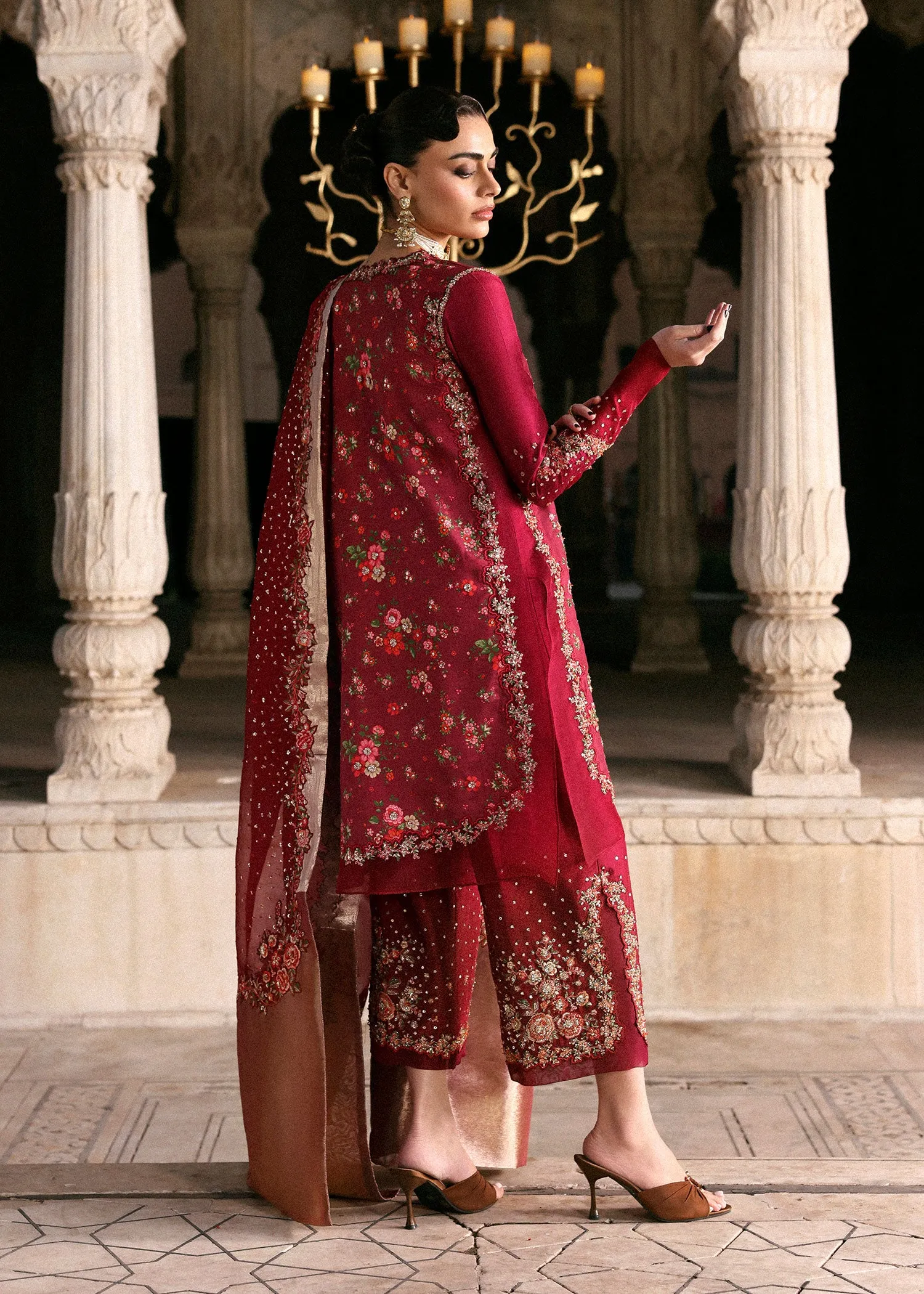 Cranberry red printed and embellished raw silk A-line shirt with organza borders, and a coordinated embellished culottes with side slits and organza hems. Paired with a matching organza dupatta featuring floral embroidery on all four sides and rose tissue facings.