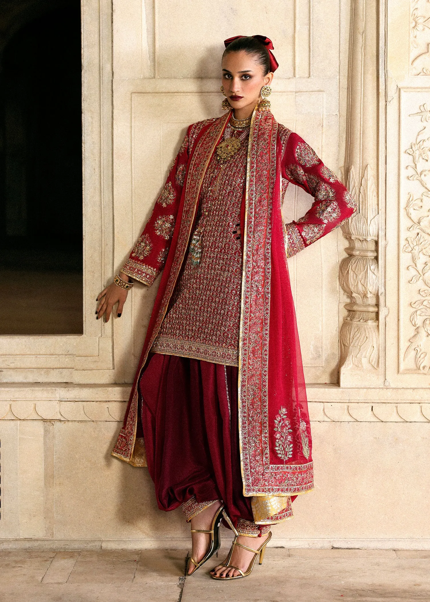 Cherry red raw silk shirt with heavily embroidered front and back, and embellished sleeves and tassels. Paired with panelled harem pants in light and dark tones with embroidered inserts. Completed with a matching chiffon embroidered dupatta finished with organza borders and mustard yellow Chindheri silk trims on all four sides.