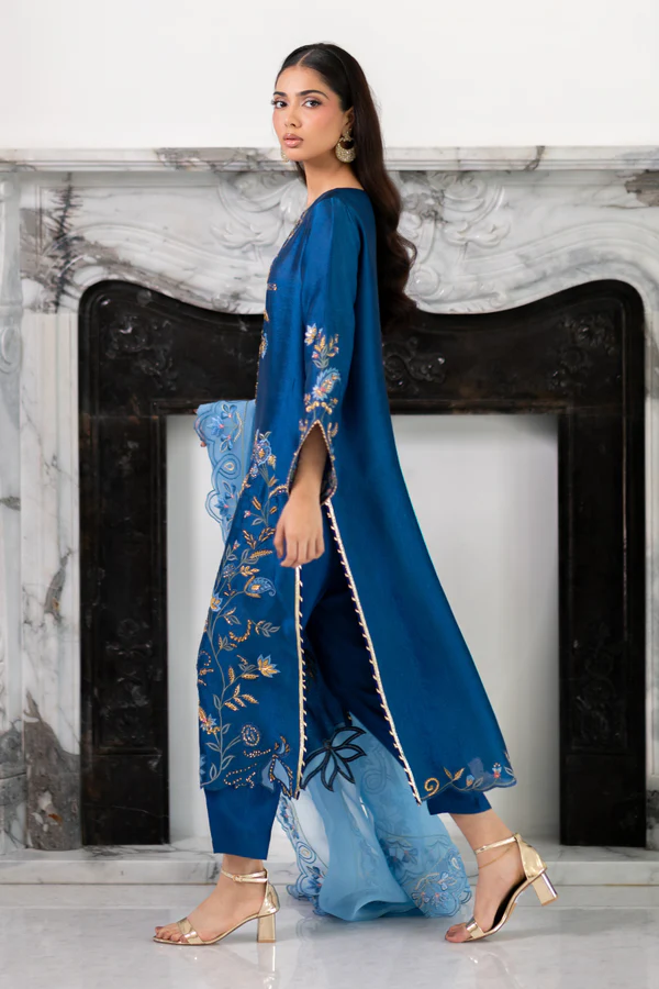This signature teal Mina Hasan outfit is perfect for summer events! The neckline features floral embroidery, with floral motifs and lots of detailed zardozi kaam all over. The outfit is completed with a matching straight pant and a contrasting blue dupatta with teal embroidered florals.