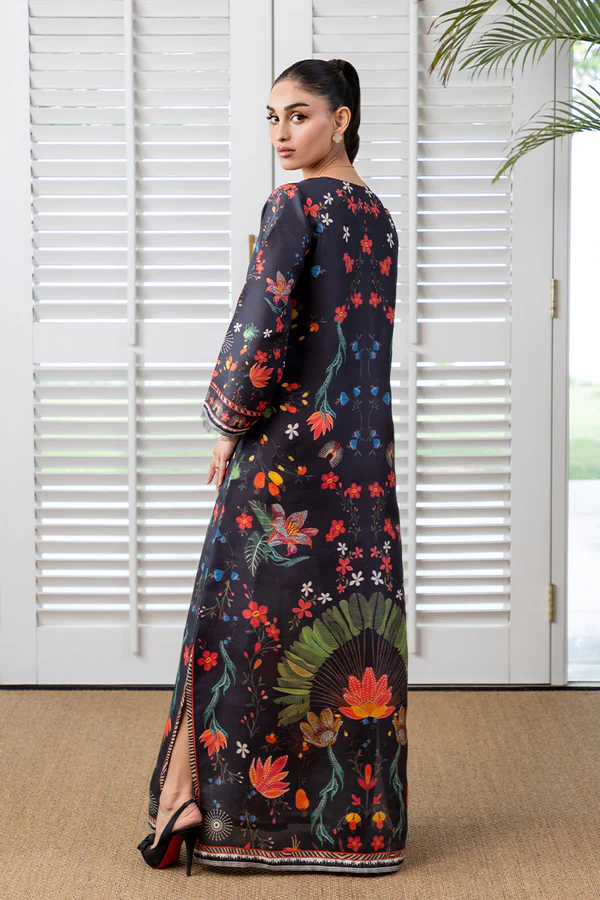 Look like a vision in this black Signature Mina Hasan printed kaftan! Featuring watercolor florals feature a banana palm tree highlighted toward the hem of the kaftan.