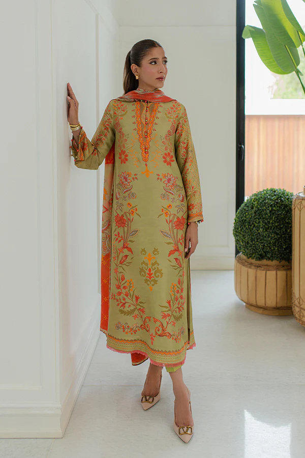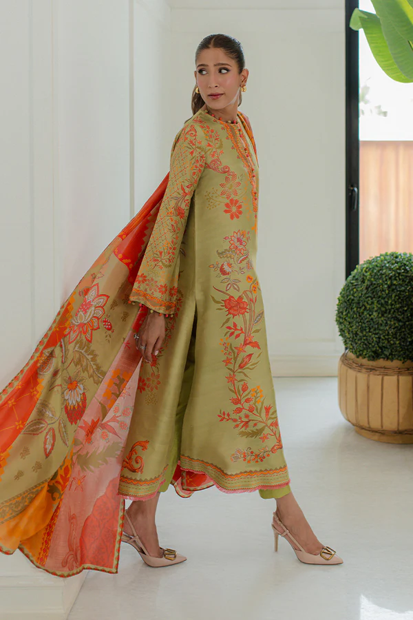Look ever graceful in this pistachio Signature Print Mina Hasan kurta. Featuring muted floral blossoms on the kurta and the dupatta, the outfit is completed with a pair of solid pants.