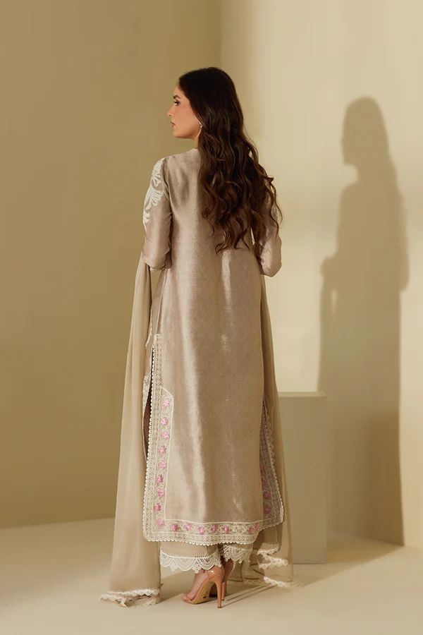 Look graceful as ever in this long straight shirt that features delicate floral theadwork throughout the shirt with light hues on the neckline. The outfit is competed with ezaar pant and a matching chiffon dupatta.
