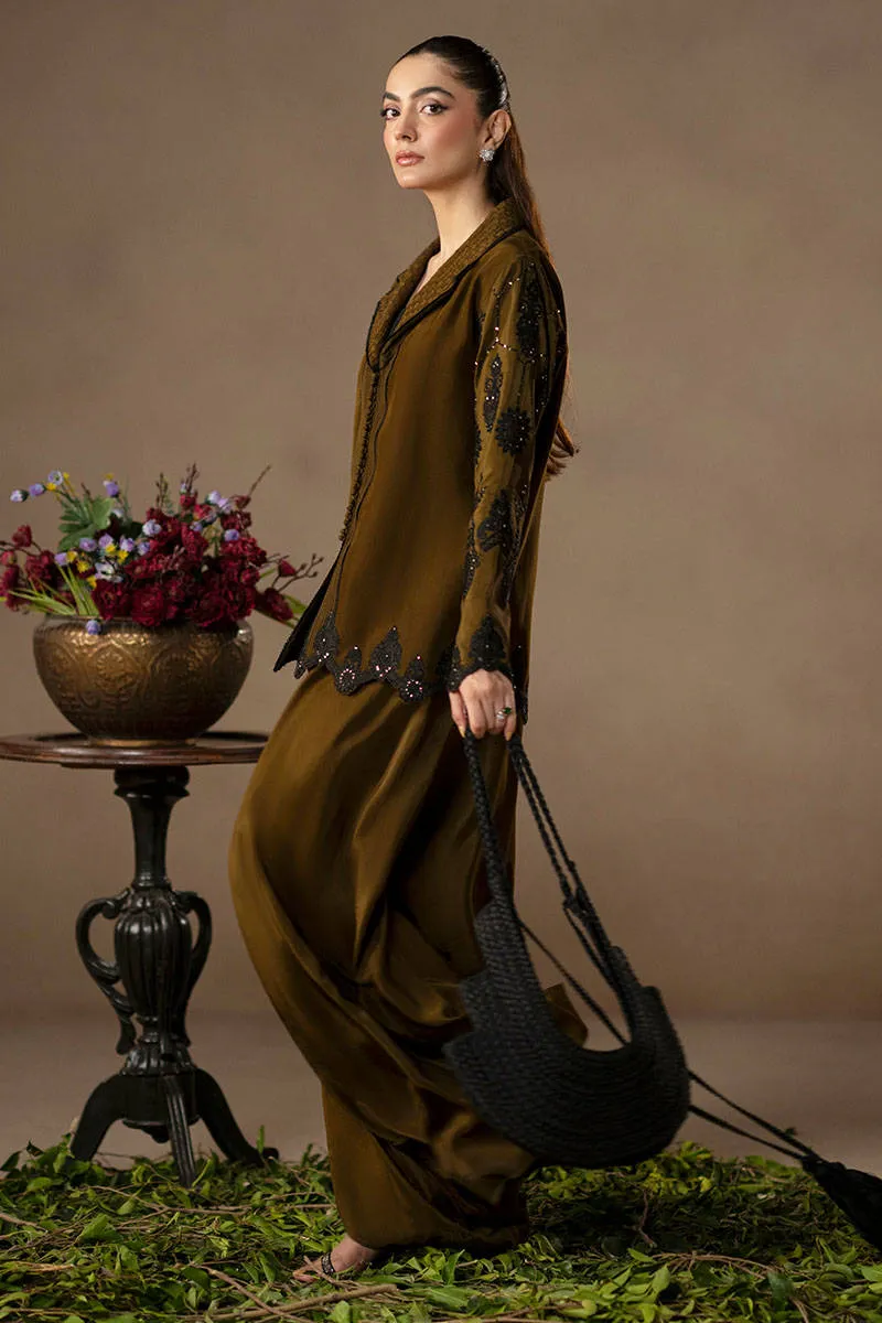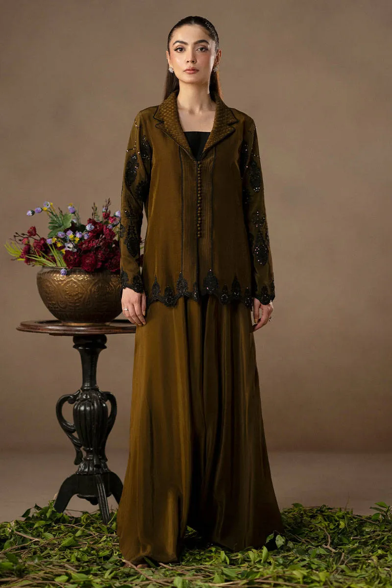 Tailored for chai, built for showing up. For those who prefer their tea plans with a side of edge, the Tiva ensemble serves up just the right mix of structure and fluidity. In a deep moss green, the jacket features a standout lapel, woven in basket weave-like effect and outlined in black thread that leads the eye straight into the details. Embroidery traces the sleeves and hem, while the front fastens neatly with loop buttons. Paired with matching flared trousers, this look is all presence without ever raising its voice.