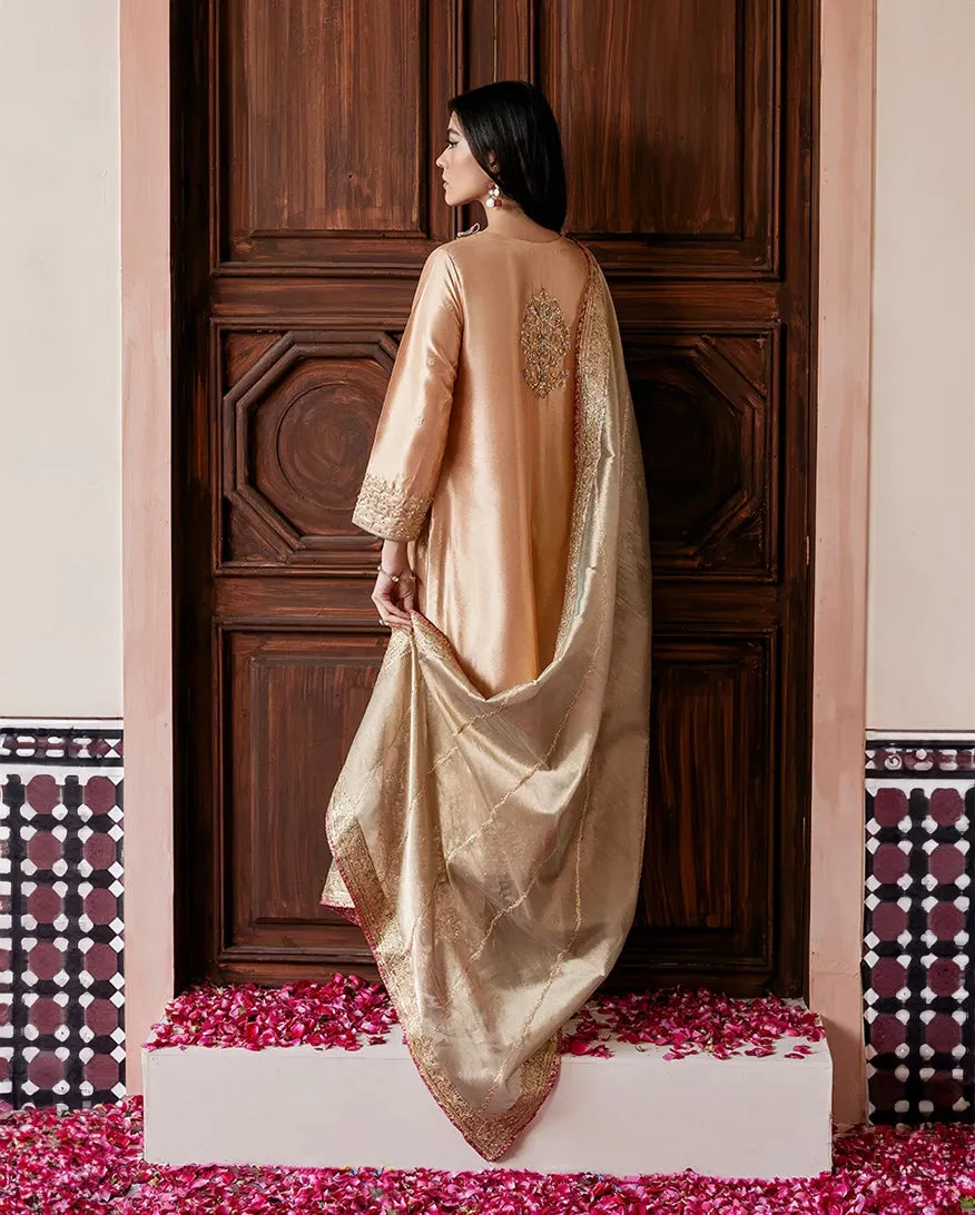 PARISA exudes the old world charm with its stunning color combination. Peach gold Zari Zari Tissue Silk shirt is delicately embellished and paired with a contrasting soft green zari tissue sequinned dupata and an embellished jamawar Izaar.