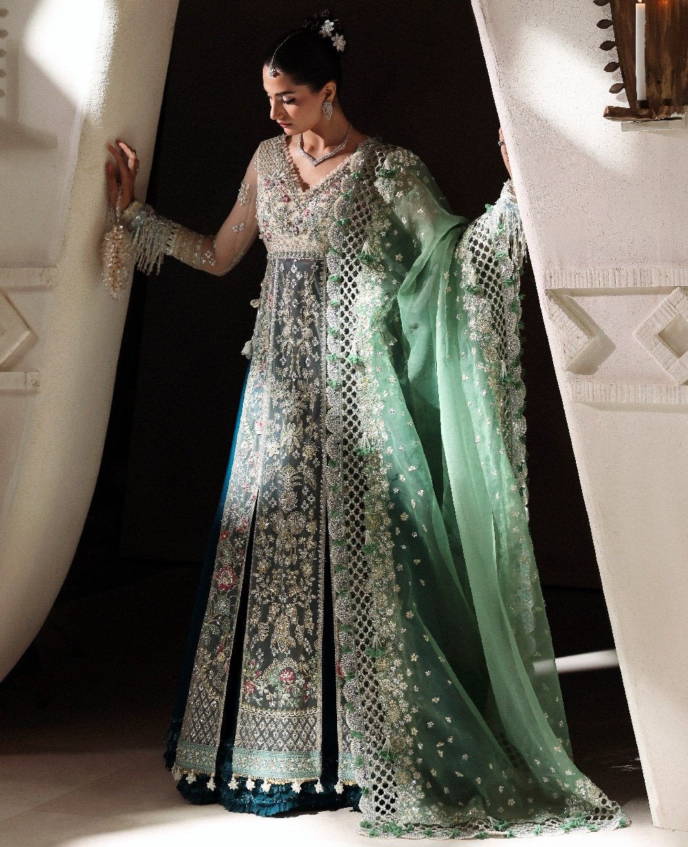 Ethereal in white, this paneled net shirt blooms with soft blush florals, muted greens, and ivory embroidery across its delicately adorned bodice. A silver sequin border traces the hem with a subtle sparkle, infusing grace with just the right touch of glamour. Paired with a striking green lehenga, the contrast feels bold yet refined, while the sage organza dupatta finished with a floral border and intricate geometric accents wraps the look in timeless charm. A perfect harmony of modern elegance and feminine allure, designed for festive soirées and unforgettable celebrations.