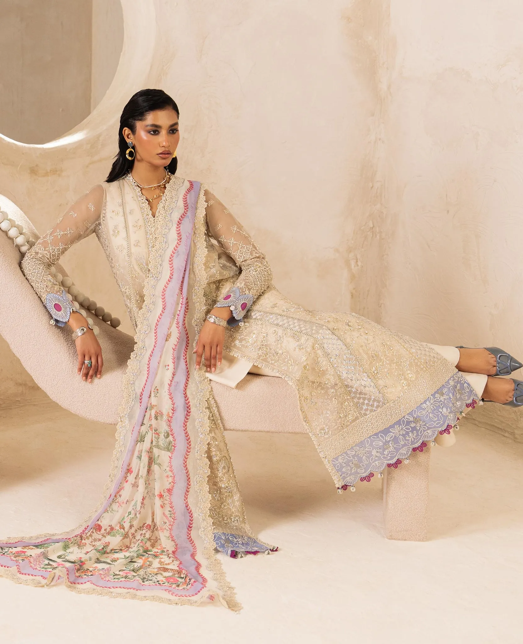 This ensemble is a graceful fusion of traditional opulence and modern sophistication, presented in a soft, regal color palette. The statement piece is a long, straight, front-open shirt in a warm ivory tone, lavishly adorned with intricate embroidery, sequins, and delicate beadwork. Crafted in sheer organza layered over a solid inner, it offers dimension and elegance without feeling heavy. The hemline is highlighted with contrasting pastel blue and lilac embroidered borders, finished with subtle tassel-inspired detailing that adds charm and movement. It is paired with a printed chiffon dupatta and wide-leg, structured ivory trousers for a balanced and refined silhouette.