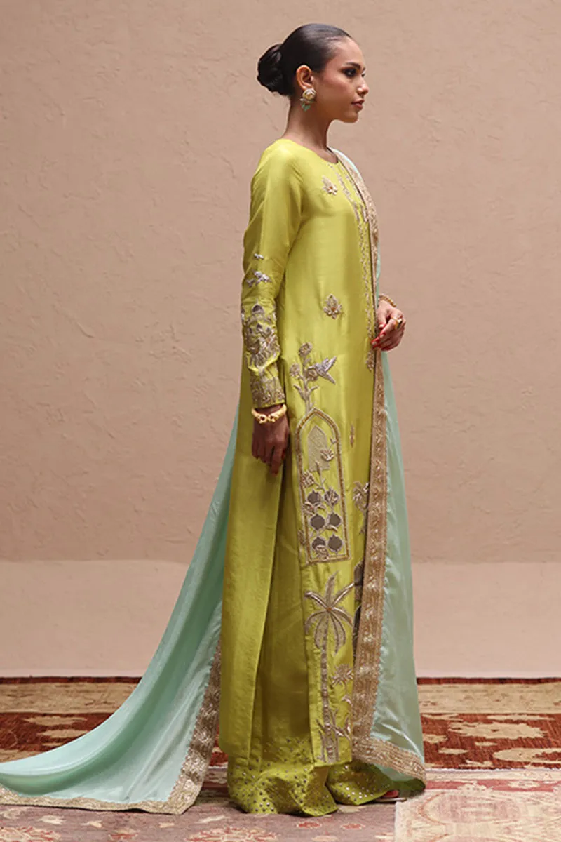 Radiant in lime, this straight long shirt in pure 80gms raw silk is beautifully adorned with light and dark gold zari embroidery, antique lame, and intricate zardozi work featuring kora, dabka, cutdana, stones, pearls, nakshi, sequins, and silver bird motifs on the front and sleeves. It pairs with culottes finished with sequins at the hem for subtle shimmer. The look is completed with three dupatta options: an aqua pure medium silk dupatta with a four-sided gold border, an aqua pure organza dupatta with scalloped zari embroidery, sequined handworked border and chan, and a gold lame dupatta detailed with zari embroidery, handworked borders, and banarsi finishing.