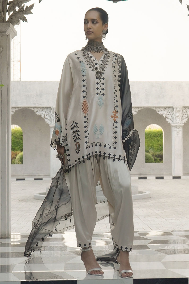 The cloud cream butter silk loose-cut short shirt, adorned with pockets, intricate screen print, coloured resham embroidery, and delicate hangings on front, back & sleeves, exudes artisanal elegance. Matched with cream gold khari shalwar in cotton charmeuse with screen-printed detailing at the bottom, and paired with a black shisha organza dupatta featuring screen print and handmade tassels for a contemporary, elevated look.