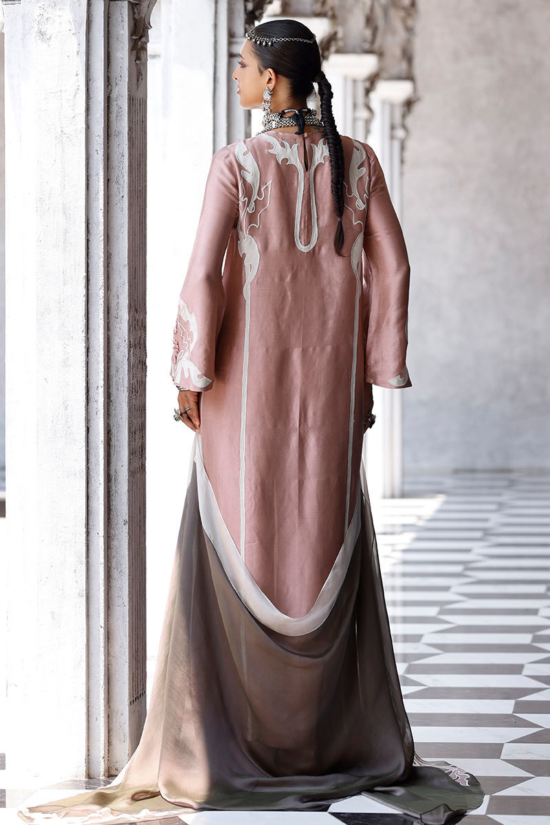 An adobe rose butter silk long shirt with high slits, adorned with self 3D, appliqué work, and resham embroidery on the front, back, and sleeves, paired with cotton charmeuse culottes and a walnut Shisha organza dupatta featuring appliqué work and resham embroidery.