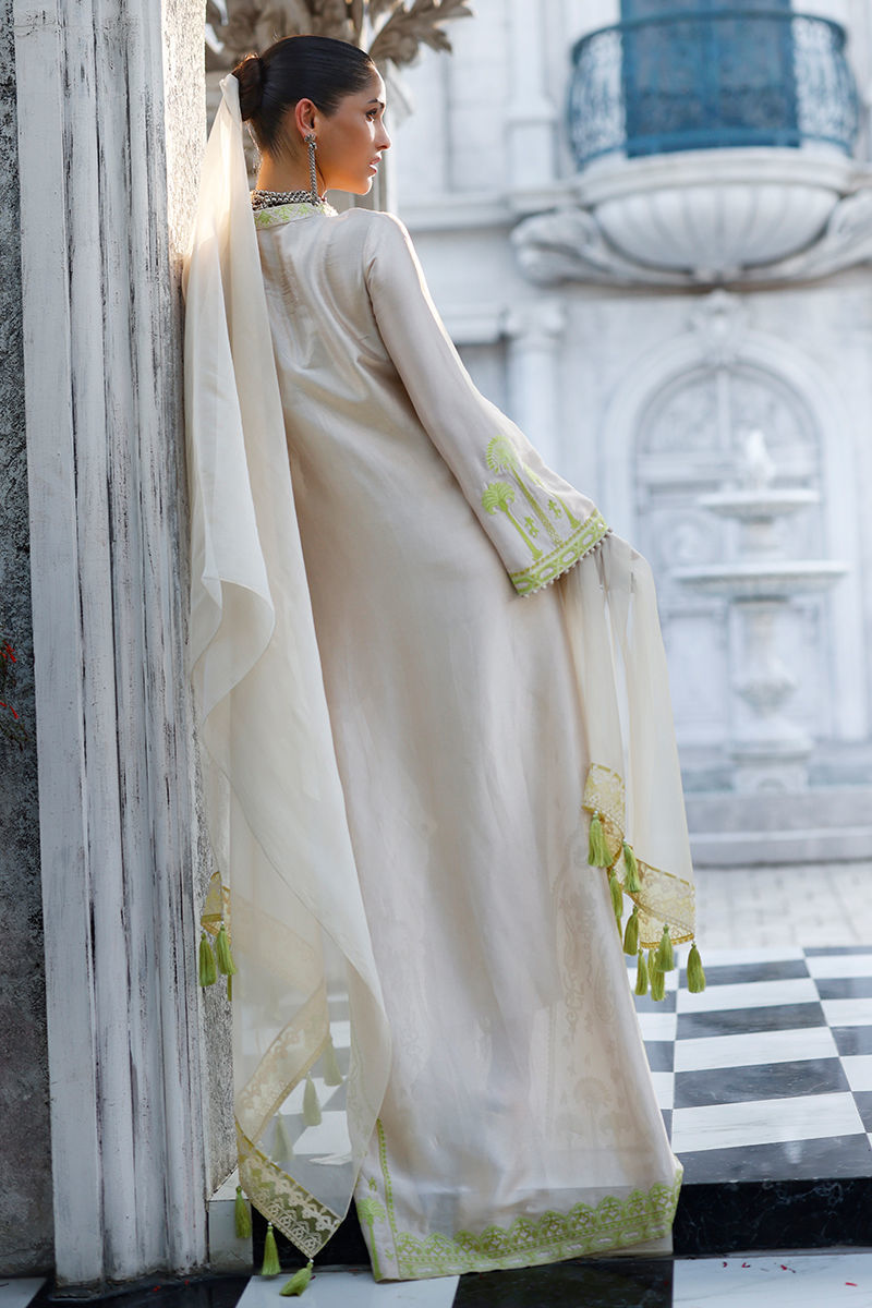 The butter cream kaftan, crafted from butter silk, features functional pockets and intricate aari embroidery with delicate handmade hangings on the front and sleeves, creating an artisanal, refined finish. It is paired with cotton charmeuse pants for effortless elegance, and completed with a matching butter cream shisha organza dupatta, detailed with an aari-embroidered border and handmade tassels for a graceful, elevated touch.