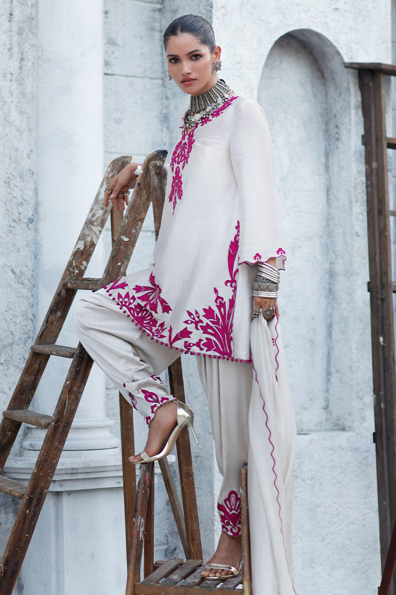 The short A-line shirt in cloud dancer, crafted from butter silk, features intricate appliqué work, resham embroidery, and delicate handmade hangings across the front, back, and sleeves, creating an artisanal and refined look. It is paired with cloud dancer khari shalwar in cotton charmeuse, detailed with appliqué work, resham embroidery, and subtle cutwork for an elegant silhouette. The ensemble is completed cloud dancer shisha organza dupatta, adorned with resham embroidery along all four sides and scalloped edges, adding a graceful and elevated touch.