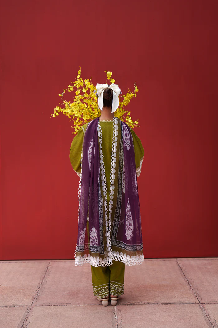DESCRIPTION: This beautiful 3-piece unstitched lawn outfit features intricate detailing and is gracefully paired with a soft, flowy chiffon dupatta.