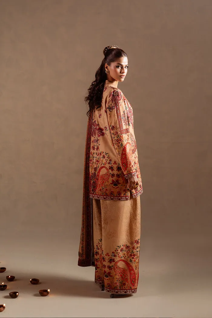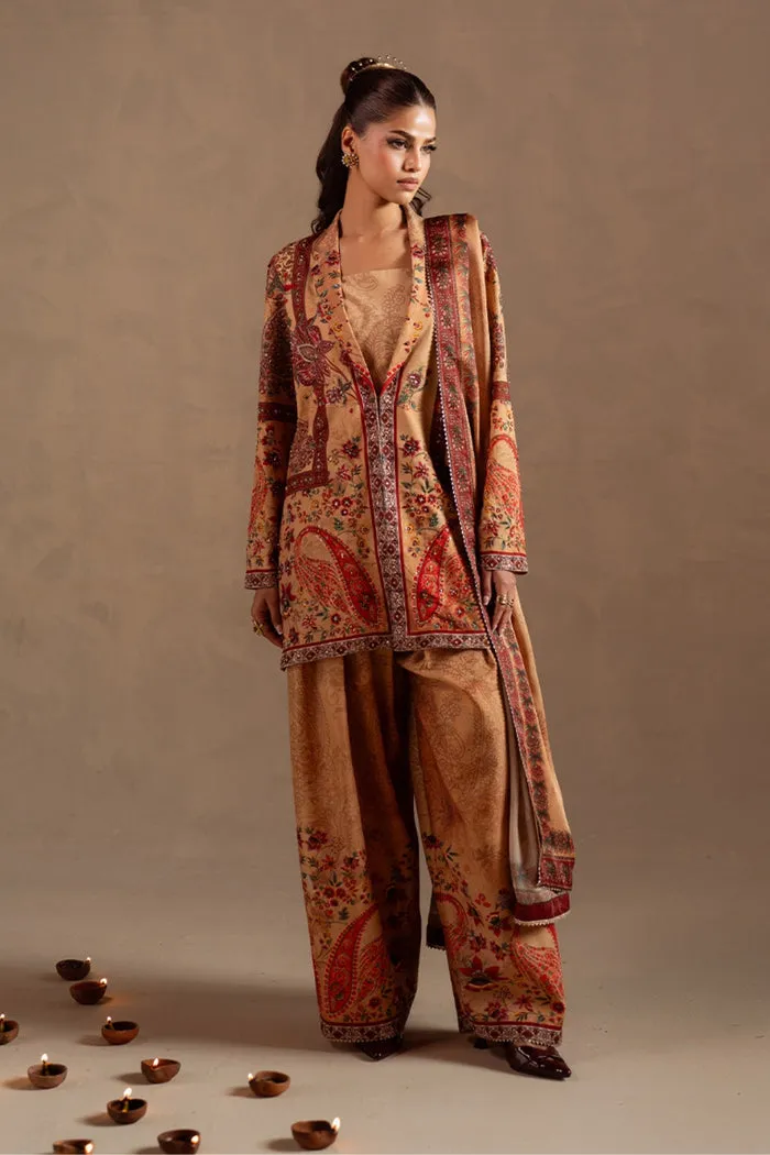 DESCRIPTION: This elegant ensemble is tailored from luxurious silk fabric, beautifully enhanced with embroidery and intricate resham detailing. A matching printed silk dupatta completes the look with effortless sophistication and grace.