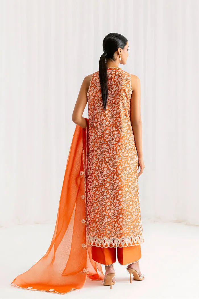 Crafted in a soft peachy orange tissue silk, this ensemble radiates subtle sophistication. Delicate resham embroidery adds a touch of traditional charm, while the laser-cut border brings a modern, refined finish. Paired with a beautifully embroidered pure organza dupatta, this look is the perfect blend of elegance and contemporary design.