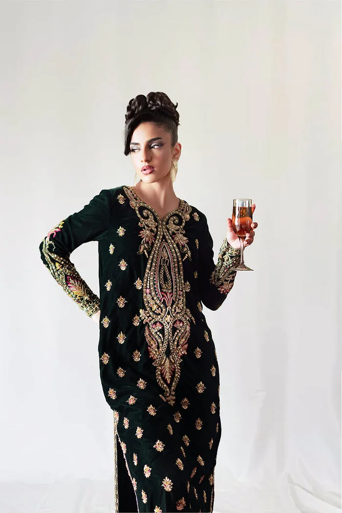 Emera is a bottle green two-piece set featuring a long shirt embellished with mirror work and fine Mukesh detailing along the front, back, neckline, and hem, with side slits adding a modern touch. Paired with straight pants, the look embodies a perfect balance. Bold yet organic, contemporary yet enduring.