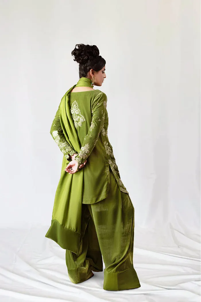 Catered to your winter dreams — Kahwa is a three-piece ensemble that embodies warmth and sophistication. The shirt is artfully detailed with embroidery and ada work along the front, back, scalloped hem, sleeves, and neckline. Paired with our signature velvet farshi shalwar and a medium silk dupatta framed in a rich velvet border; this ensemble radiates feminine charm and makes a striking statement for the season.