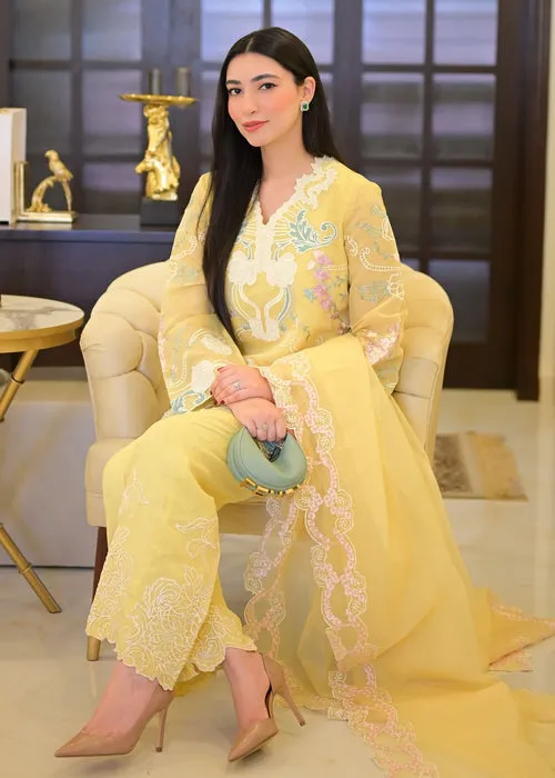 Additional Description: A Masterpiece in Canary Yellow. Dandelion hues is a radiant celebration of refined elegance, where the soft warmth of a pale yellow canvas merges with lilac floral embroidery, sage leafy vines and ivory appliqué in organza and cotton silk. This exquisite design from Saira*Shakira’s Casual Pret Collection’25 exudes a perfect balance of timeless charm and contemporary luxury. The look is completed with a cotton net dupatta,adorned with a delicate blush floral embroidered border and a cotton silk pant with ivory floral embroidered hem, perfectly capturing the essence of this collection. Dandelion Hues is a true fusion of statement of luxury and style. Shirt Length 34 Pants Length 42 Fabric Details: Shirt: Khaadi Cotton Pants: Cotton Silk Dupatta: Cotton Net Slip: Cotton Silk