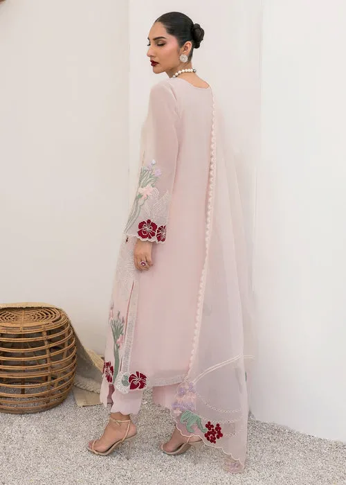 Additional Description: A desert Rose – Drenched in a soft blush hue, this ensemble is an ode to quiet refined femininity. Crafted on a Khaadi cotton canvas, we have the daman in painted blooms in old rose, and sage leaves. Dancing delicately across with intricate botanical appliqués and cutwork motifs cascading in graceful harmony. The neckline is framed with delicate floral vines in ruby threadwork. Paired with a cotton net dupatta adorned with ethereal floral pallus beautifully finished in uneven scallops. This design is spirit of a blossoming desert. Shirt Length 50 Pants Length 37 Fabric Details: Shirt: Khaadi Cotton Pants: Cotton Silk Dupatta: Cotton Net Slip: Cotton Silk