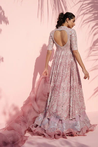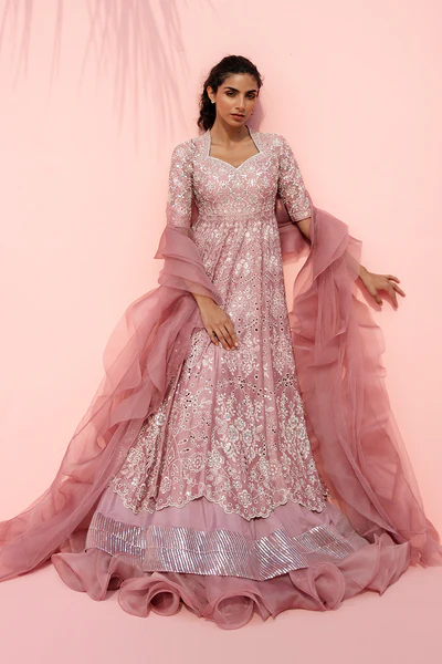 A dusty pink silhouette unfolds in soft, romantic layers. A delicately embroidered khaddi silk peshwas shimmers with intricate floral and eyelet detailing across the hand embroidered surface, highlighted with subtle sequin accents. The slim fit bodice opens into a graceful flare, finished with a scalloped border, while organza patches accent the three quarter eyelet embellished sleeves and the back, further defined by a heart shaped cutout. A layered organza lehnga over crepe, edged with a luminous sequin border and sculpted ruffle hem, introduces quiet drama. Paired with a sheer tulle dupatta finished with organza ruffles that drape effortlessly, the ensemble feels refined and dreamlike in presence.