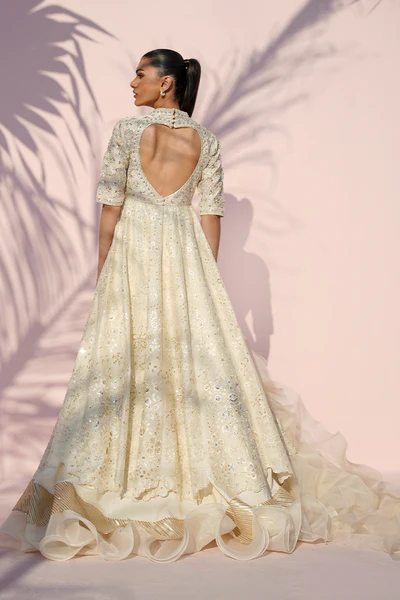 An ethereal ivory silhouette unfolds in soft, romantic layers. A delicately embroidered khaddi silk peshwas shimmers with intricate floral and eyelet detailing across the hand embroidered surface, highlighted with subtle sequin accents. The slim fit bodice opens into a graceful flare, finished with a scalloped border, while organza patches accent the three quarter eyelet embellished sleeves and the back, further defined by a heart shaped cutout. A layered organza lehnga over crepe, edged with a luminous sequin border and sculpted ruffle hem, introduces quiet drama. Paired with a sheer tulle dupatta finished with organza ruffles that drape effortlessly, the ensemble feels refined and dreamlike in presence.