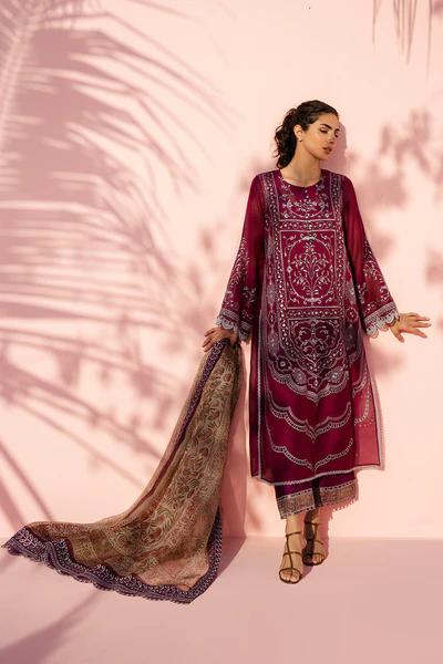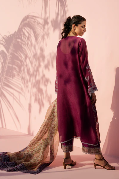 Rendered in a deep plum tone, this A line khaddi corduroy shirt is delicately embroidered with intricate threadwork and eyelet detailing, unfolding in ornate panels across the front. Fine scalloped borders along the sleeves introduce soft texture, while button accents at the neckline create a subtle focal point. The look is grounded by matching pure rawsilk culottes, finished with a contrasting printed hem and eyelet detailing for gentle contrast. An earthy toned organza dupatta, composed with a botanical print and framed with embroidered plum borders and eyelet accents, lends a whisper of vintage romance.