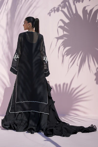 Evoking modern romance, this deep ebony ensemble unfolds in fluid layers. A sheer khaddi corduroy shirt is adorned with ivory toned floral appliqué embroidery drifting across the surface in delicate, painterly trails. Scalloped embroidered borders frame the hem and cuffs. A softly draped khaddi silk dhaka pajama introduces graceful movement, while a ruffled georgette dupatta falls effortlessly, completing the look with poetic ease.
