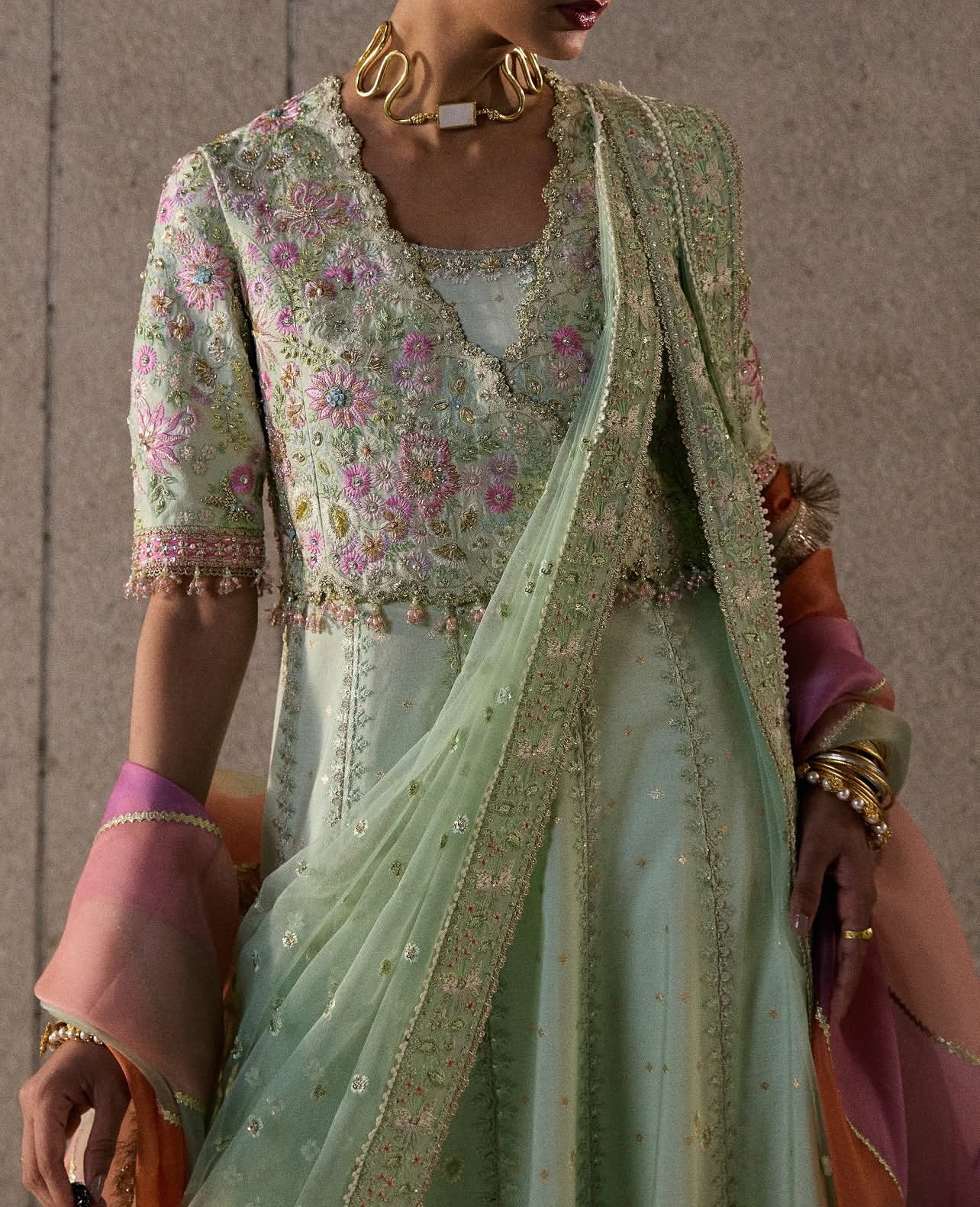 In refreshing icy mint, this six-piece look features a jacquard silk pishwas with a scoop neckline, hot pink contrast borders, and lace-lined panels. Sleeve options include half or full, both embroidered and finished with tassels. A raw silk coatee wraps over the pishwas, fully embroidered with multicolored handwork, scalloped edges, and tassel detailing. Paired with matching loose raw silk pants and a printed slip. The double-drape net dupatta is finished with embroidered borders and a soft mesh spray, offering versatile styling.