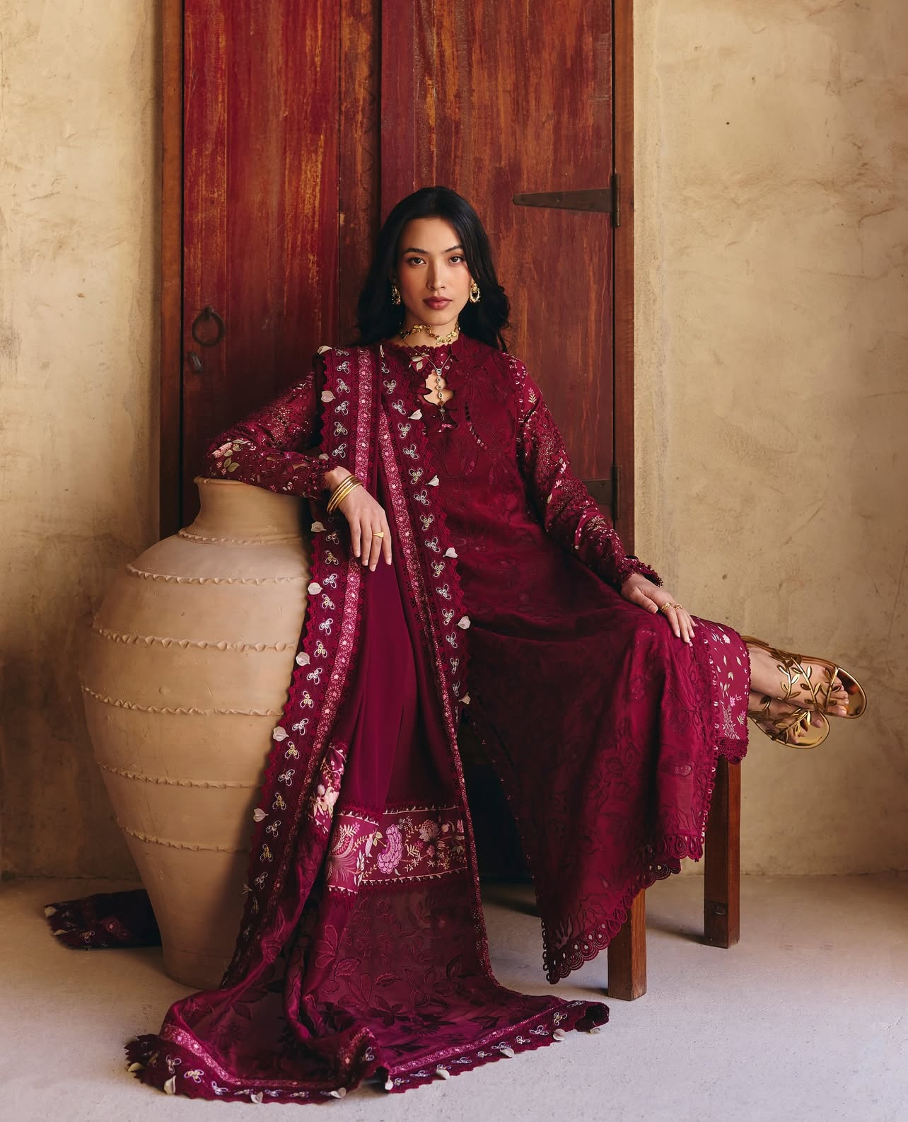 Step into spring and summer’s light with this 4-piece Maroon ensemble, a vision of renewal for Eid. The double-layered kurta boasts intricate cutwork and embroidery over a printed lawn inner, paired beautifully with maroon lawn cullottes and a detailed chiffon dupatta, offering variance in texture and design.