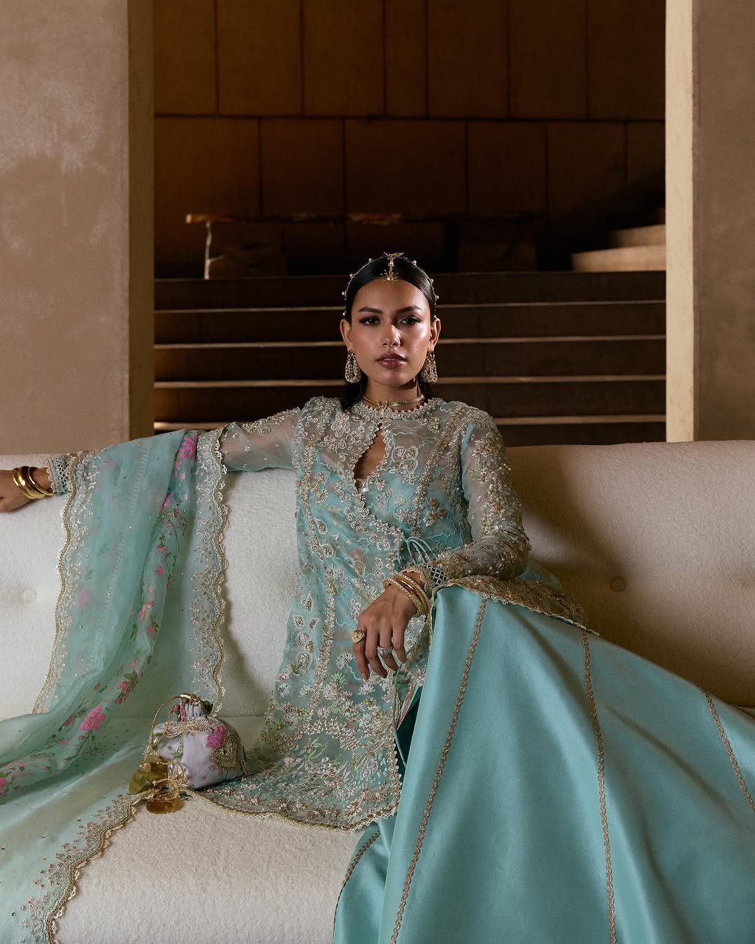 In serene aquamarine, this four-piece look exudes refined elegance. The organza paneled angharaka peplum features a keyhole neckline with tassels, lace accents, and sequin edging over a floral print silk slip. Paired with raw silk paneled sharara pants and a matching organza dupatta with scalloped borders, screen print, and tasselled paan patta motifs, the ensemble is a vision of grace.