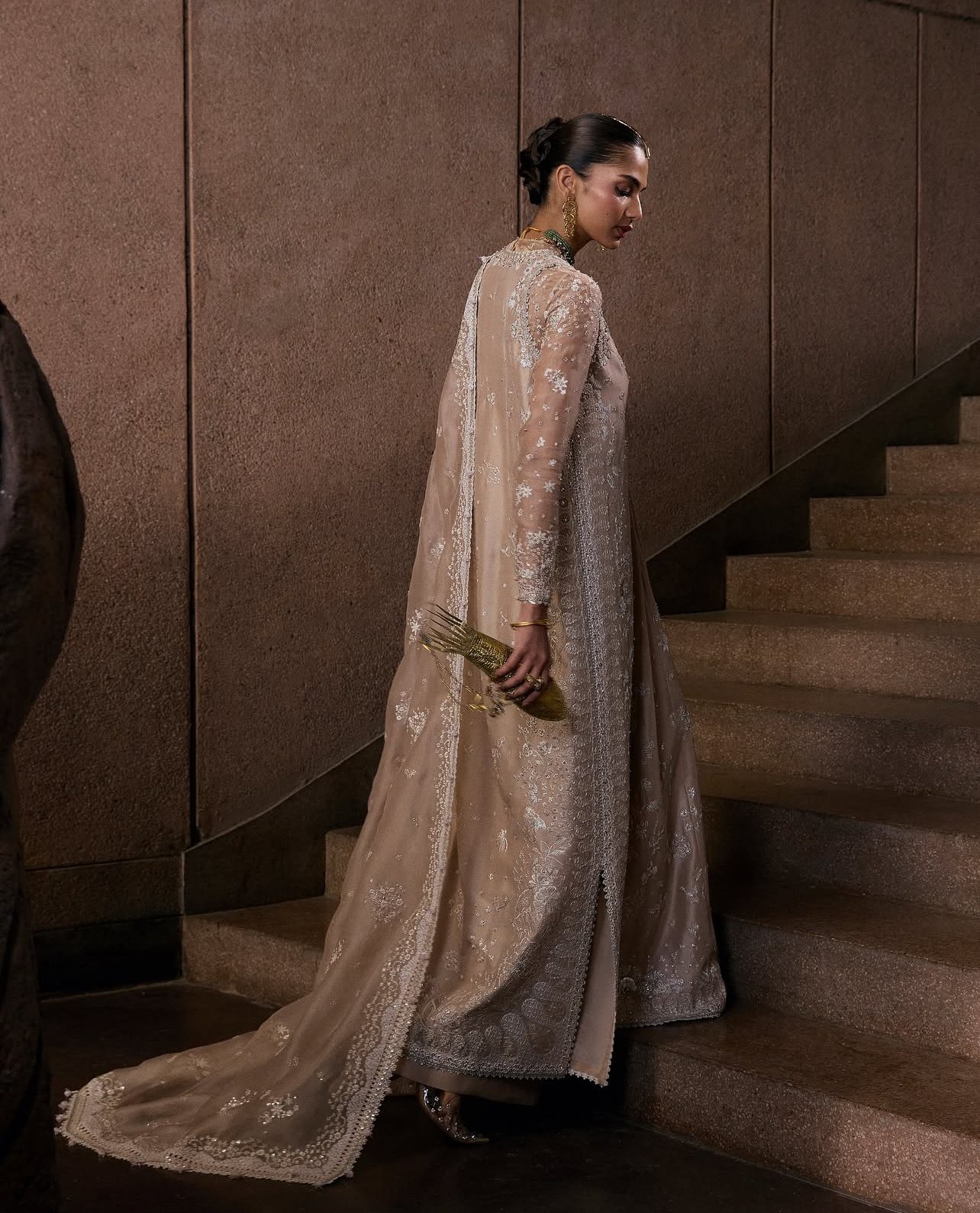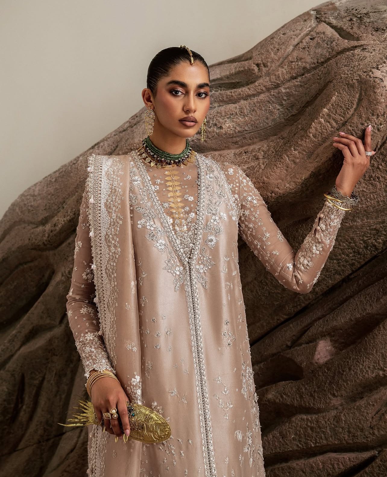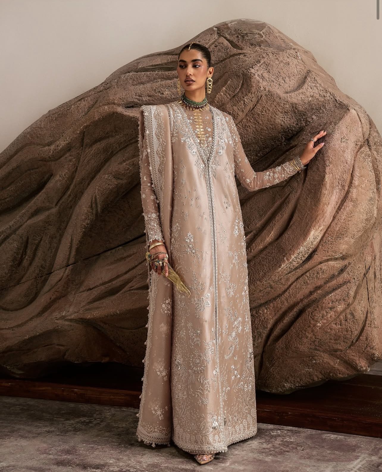 Luxury in nude beige, this four-piece design defines modern elegance. The raw silk front – open shirt features a plunging halter neckline with organza fitted sleeves straight undershirt embroidered with white and silver motifs. Styled with a silk slip , bell-cut silk pants, and an organza dupatta finished with sequins, layered borders, and tassels, the ensemble is sophisticated and refined.