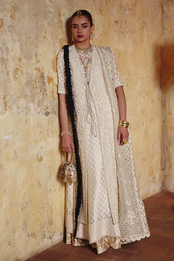 - Ivory white organza dupatta with scalloped lace and contrasting bordered spray