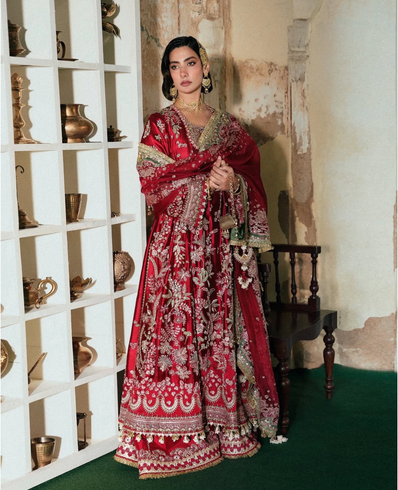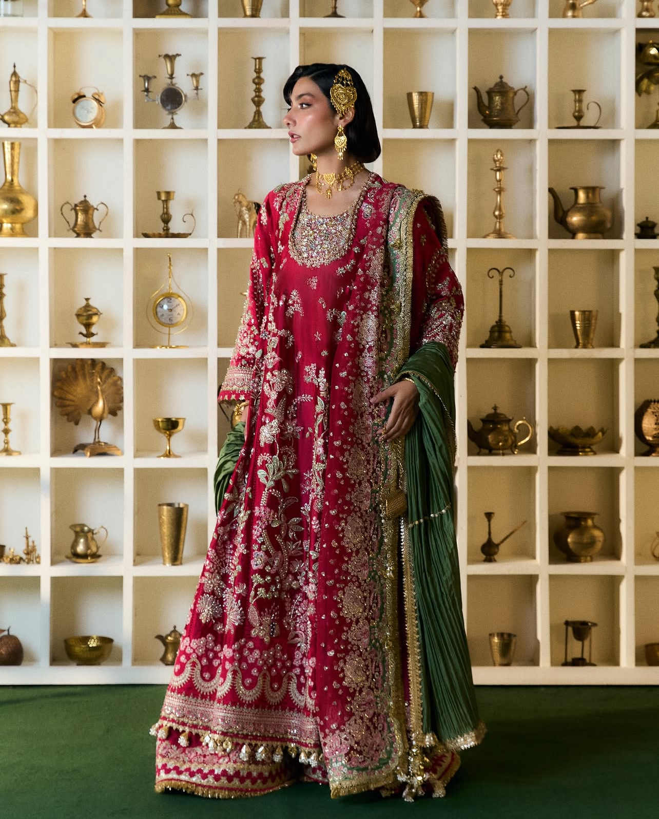 A vision of heritage and modern luxury is reborn in this three-piece ensemble, commanding attention in vibrant red. The centerpiece is a five-panelled, silk red pishwas, featuring a scoop neckline and fitted sleeves, dramatically accented with contrasting gold, green, and blue embroideries. It is perfectly paired with red raw silk Sharara pants, elegantly bordered with three distinct types of detail and kiran work. The look culminates with an organza red dupatta, framed by a four-sided border and a striking accent green border, embodying variance and timeless class.