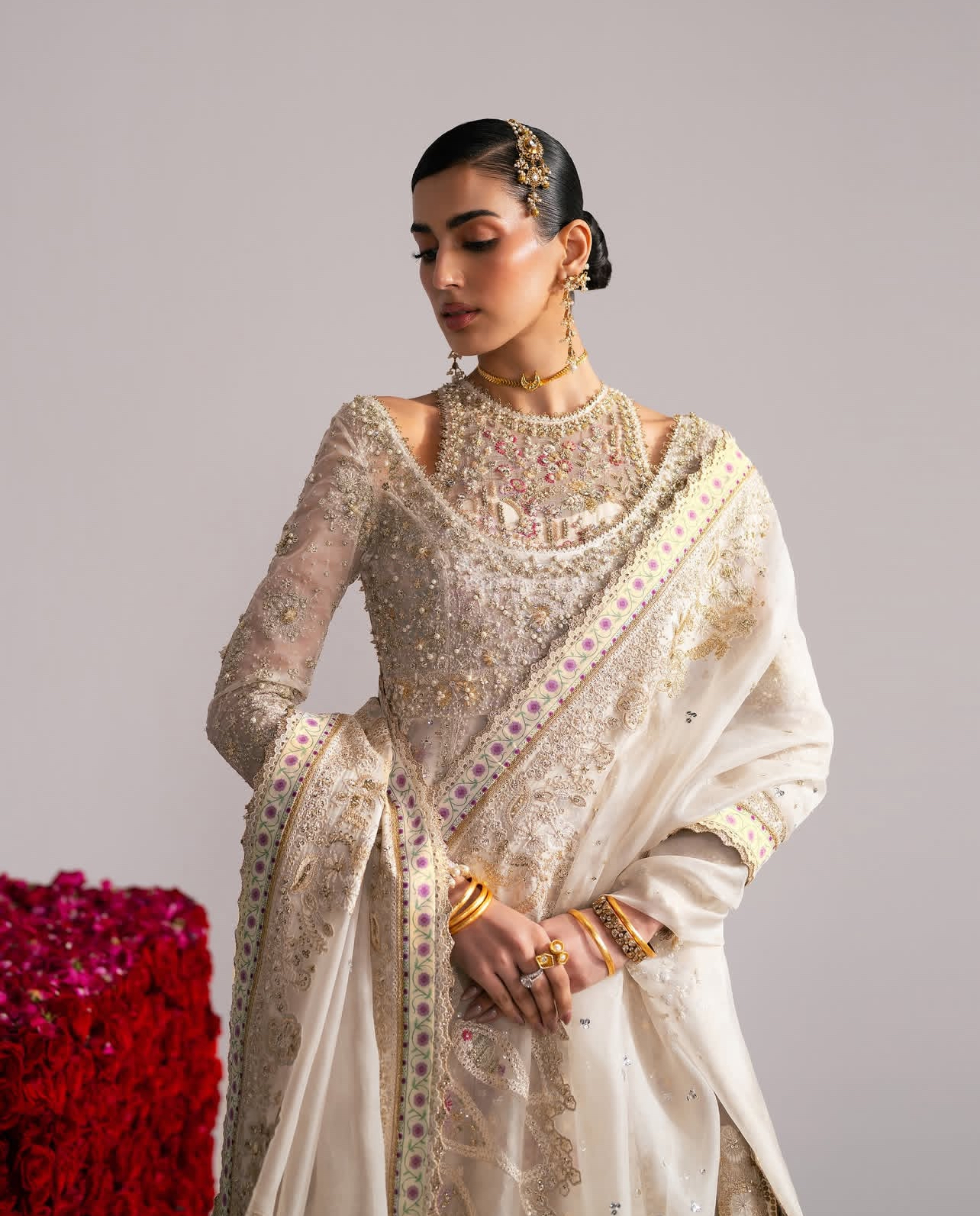 A vision of renewal and luxury, this 3 Pcs Ivory ensemble features an Organza ivory shoulder cut-out pishwas with an attached raw silk underlayer, showcasing embroidery on the blouse and detailed borders at the hem. The shirt has fitted three-quarter sleeves and a halter neckline on the upper layer. It transitions into heavily embroidered raw silk gharara pants. Complemented by an Organza ivory dupatta with spray details, a four-sided border, and different shades adding depth and contrast, this piece embodies class and heritage with exquisite variance.