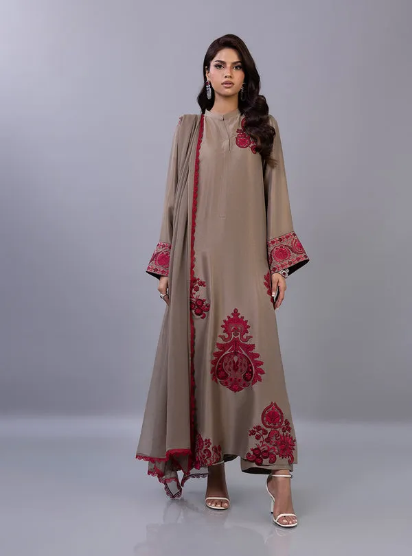 Exude an air of refined grace in this stunning taupe ensemble, a perfect fusion of muted elegance and fiery artisanal detail. The long shirt is meticulously crafted with a clean band collar and a hidden placket, serving as a sophisticated canvas for the bold, crimson-red embroidery that anchors the hem with majestic Suzani motifs. Intricate floral sprays adorn the shoulder and back, while the wide statement cuffs feature dense, traditional threadwork that adds a layer of heritage charm. Completed with a matching pants and a lightweight dupatta finished with a delicate red lace.