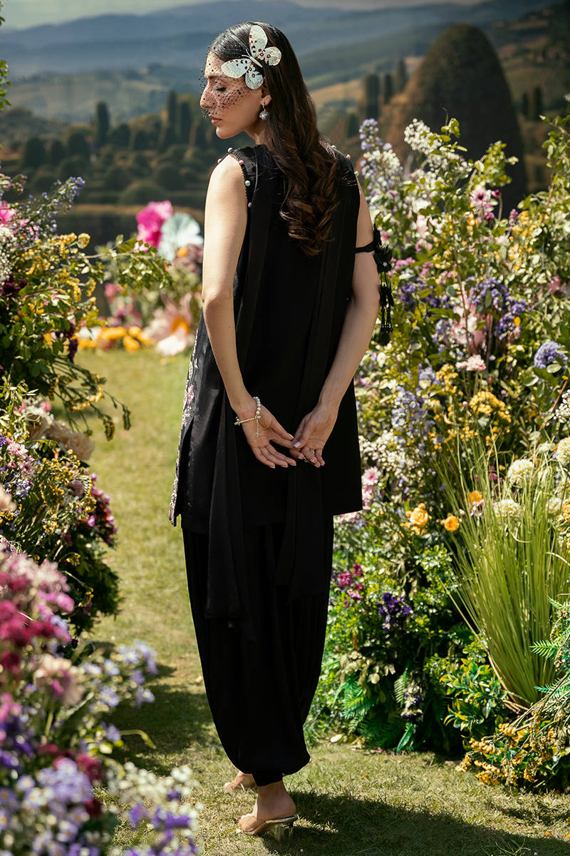 A striking black ensemble featuring a short sleeveless shirt, elevated with delicate pearl detailing tracing the neckline and sleeve hems. Intricate embroidery embellishments add depth and texture, giving the piece a refined handcrafted allure. It is paired with a Scandinavian-style scarf, subtly adorned with pearls that echo the shirt’s detailing, creating a cohesive and elegant rhythm. The look is completed with voluminous balloon pants, adding structure and modern ease to the silhouette.