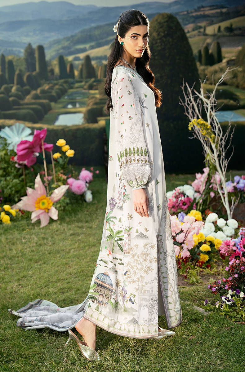 A Straight Shirt that features a refined V-neckline and softly puffy sleeves that add a modern, feminine touch to the silhouette. It is paired with sleek straight pants for a clean and graceful fall, creating a balanced and timeless look. The outfit is completed with a beautifully printed dupatta that enhances the overall charm with its artistic detailing and fluid drape.