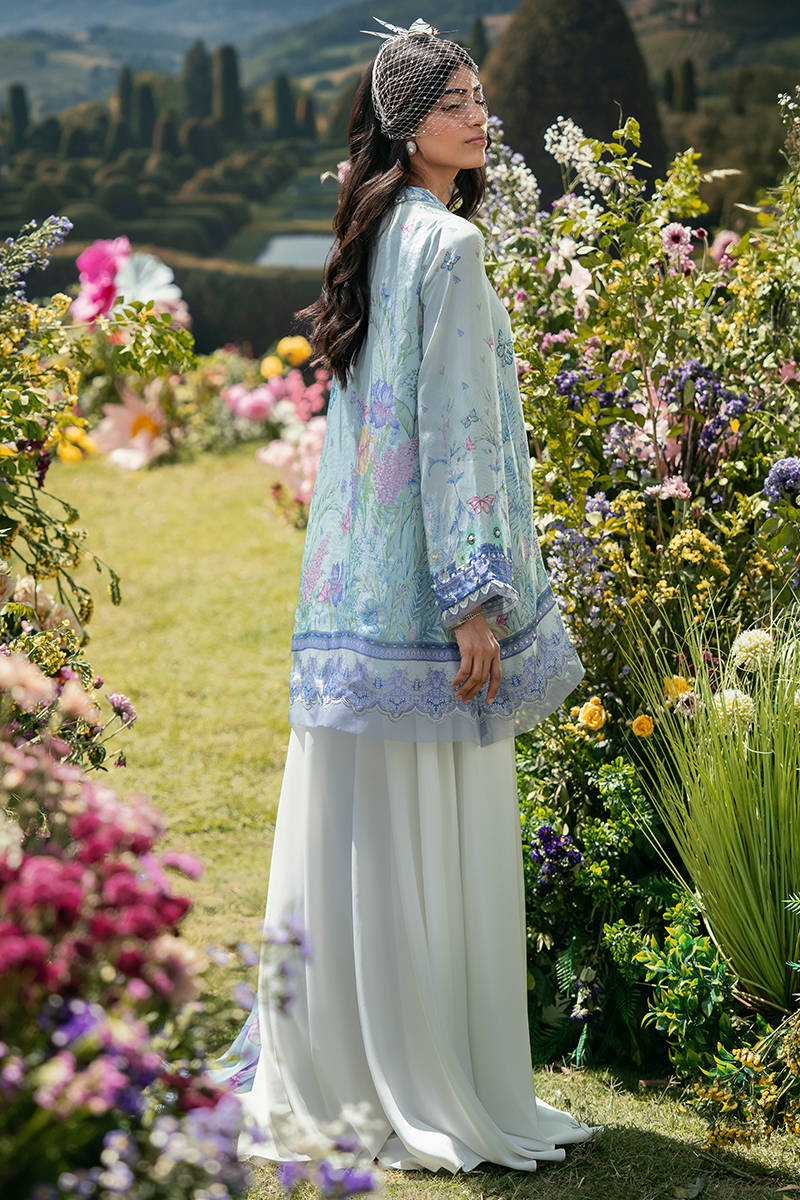 In a vibrant blue print, this short shirt features a classic collared neckline that adds a structured, timeless touch to the silhouette. Paired with Bambi pants, the look balances comfort with modern elegance, while the coordinated dupatta completes the ensemble with a soft, flowing finish. The overall outfit feels fresh, easy, and effortlessly put together.