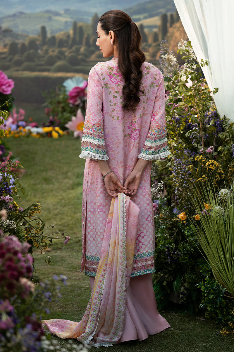 A charming pink ensemble featuring a straight-fit shirt adorned with a playful polka print, complemented by a sleek band neckline with a subtle V-shaped cut. The front neckline is enhanced with delicate motifs, adding an intricate focal point, while the ruffled floral sleeves bring a soft, romantic flair to the design. Paired with tailored pants and a printed dupatta.