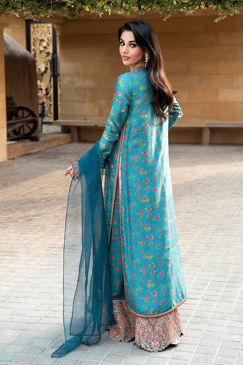 Digitally printed teal shirt crafted from pure raw silk, giving the ensemble a rich texture and luxurious finish. The shirt is enhanced with delicate hand embellishments, adding subtle sparkle and intricate detailing that elevate its overall appeal. Paired with the shirt is a matching digitally printed pant made from premium PK raw silk fabric, featuring tasteful prints that complement the shirt perfectly while maintaining a graceful silhouette.Completing the look is a lightweight organza dupatta that adds sophistication and movement.