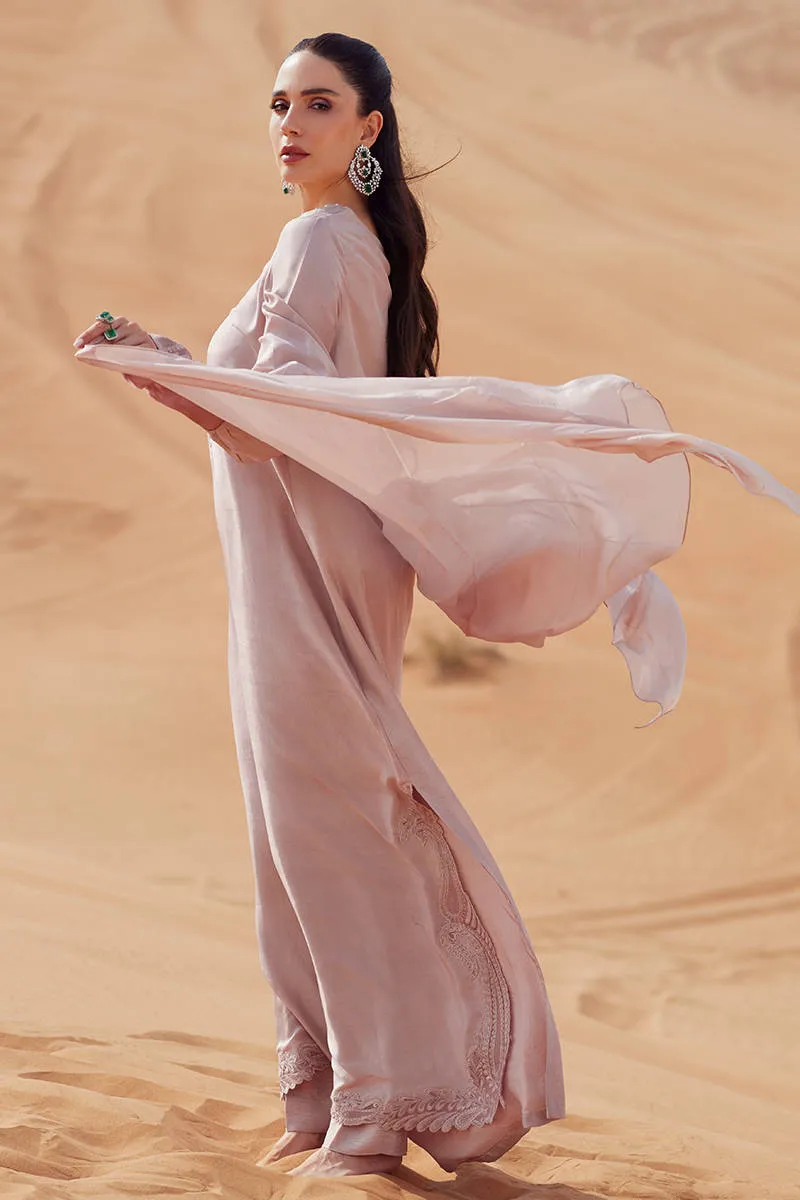 A pure raw silk shirt designed in a fluid kaftan silhouette, elevated with intricate embroidery and pearl embellishments along the neckline. Detailed cuff sleeves feature refined embroidery, adding structure and elegance. Paired with a tailored Korean silk cigarette trouser and finished with a KP silk scarf for a clean, contemporary look.