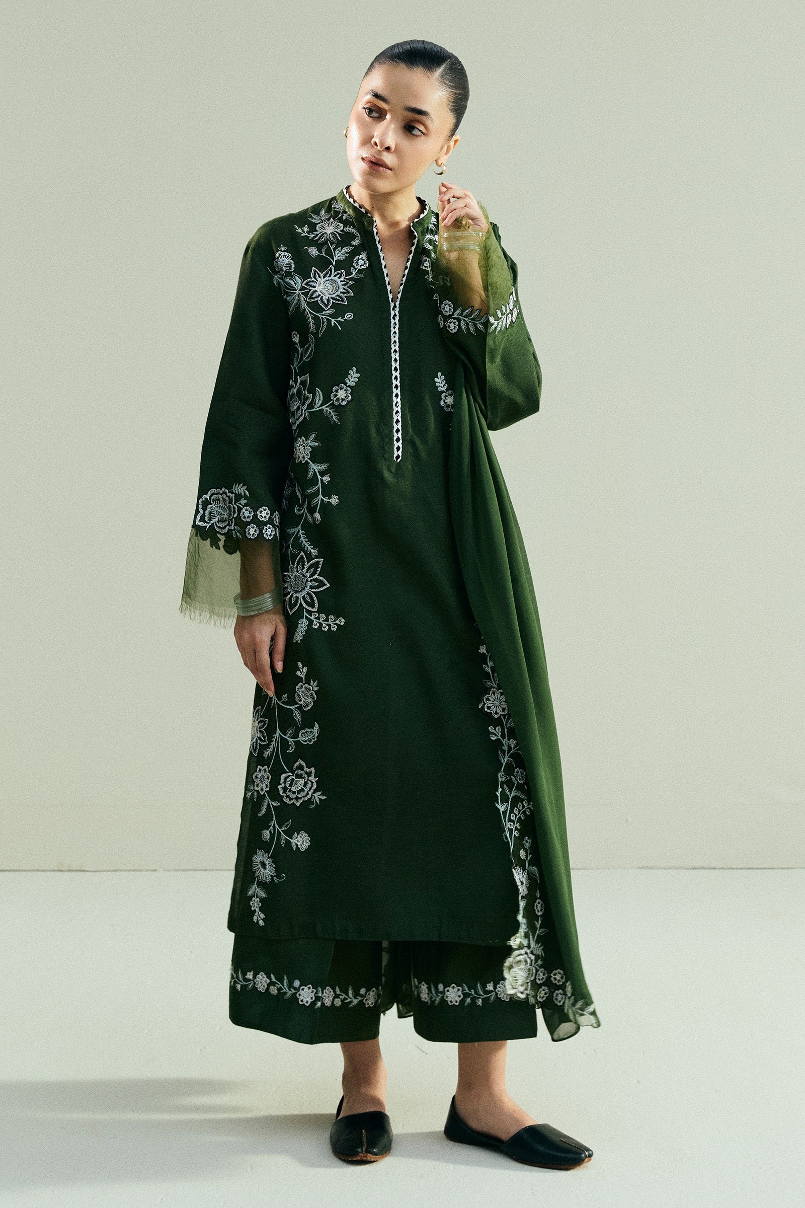 This loose-fit green shirt is decorated with black and white embroidery across the front, bringing a striking contrast to the design. It is paired with culottes featuring delicate embroidered details that add balance and ease. A minimal tonal dupatta completes the look, keeping the focus on the understated yet refined craftsmanship.