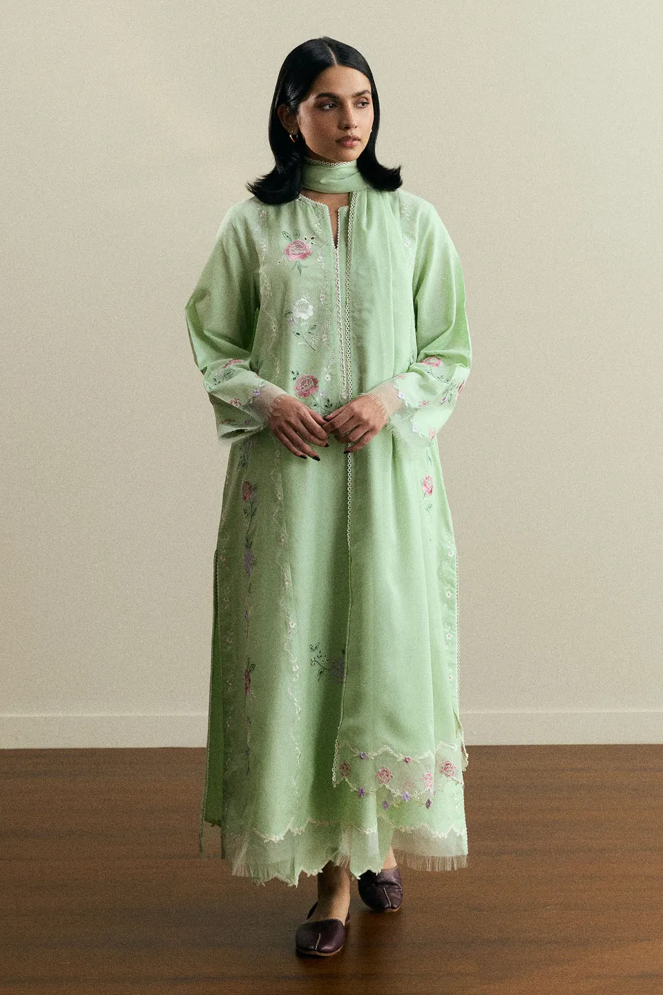 A long paneled kameez featuring delicate embroidery on the front and sleeves, enhanced with subtle organza details. Paired with wide-hem embroidered pants and a matching chiffon dupatta, this ensemble exudes refined elegance, seamlessly blending traditional artistry with modern sophistication.