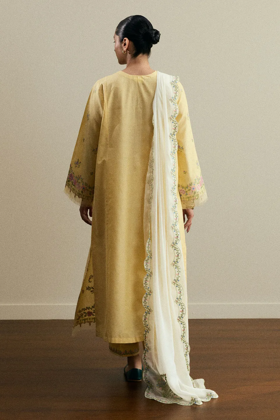 A yellow paneled kurta adorned with delicate cross-stitch embroidery, exuding artisanal charm. The contrasting chiffon dupatta, detailed with intricate work, adds a graceful flow, creating a festive-ready ensemble that celebrates tradition with effortless elegance.